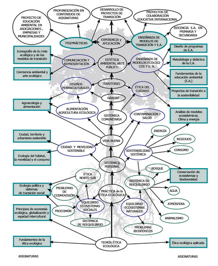 DESEEEA está basado en un esquema arbóreo, vertebrado por los fundamentos y el desarrollo contemporáneo de la ética ecológica como matriz teórica transdisciplinar. Desde esta raíz, se incorporan materias y asignaturas específicas que abordarán las principales áreas que intervienen en la construcción de una sociedad desde la perspectiva ecológica. La rama de estudios biofísicos viene equilibrada por materias y asignaturas centradas en la organización interna de las sociedades en transición hacia la sostenibilidad: economía ecológica, ecología política, procesos de globalización y ética norte-sur; con la finalidad de que el alumno adquiera una visión de conjunto de los retos de la sostenibilidad, tanto en la esfera de los ecosistemas naturales como en los modelos sociales.