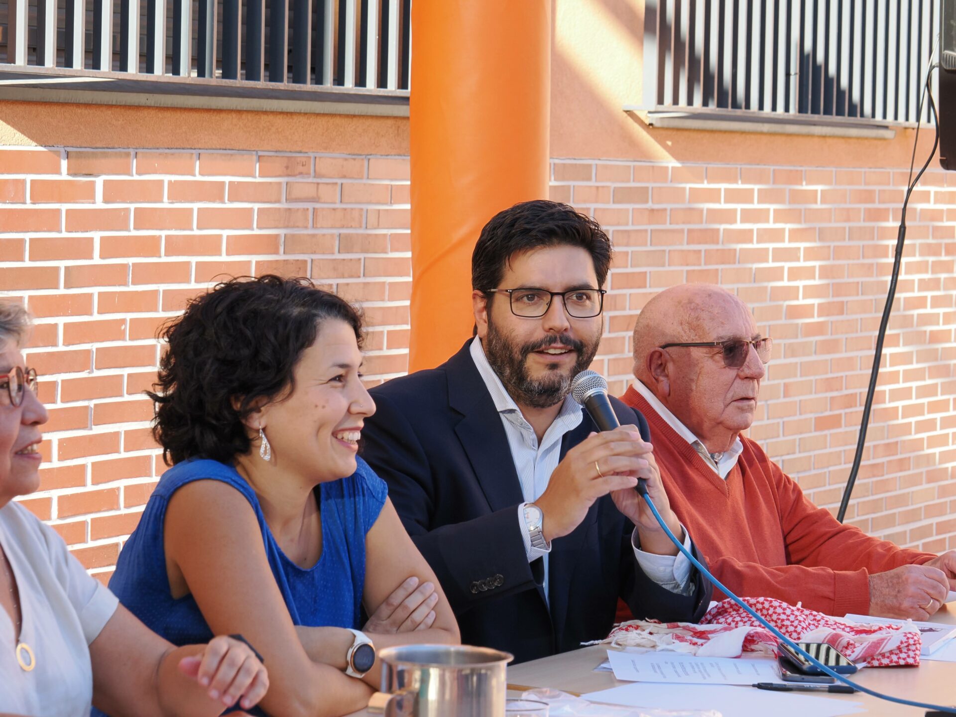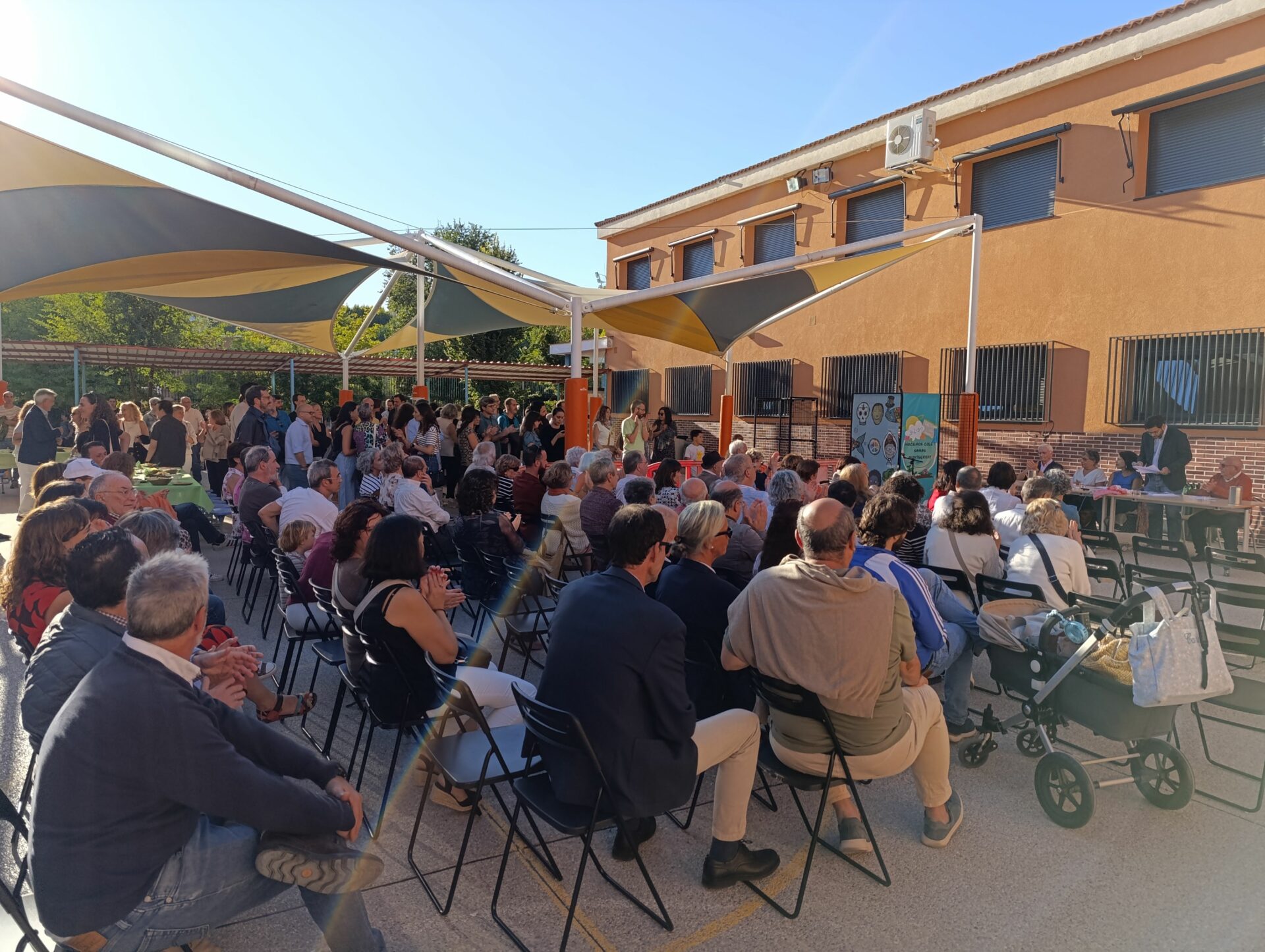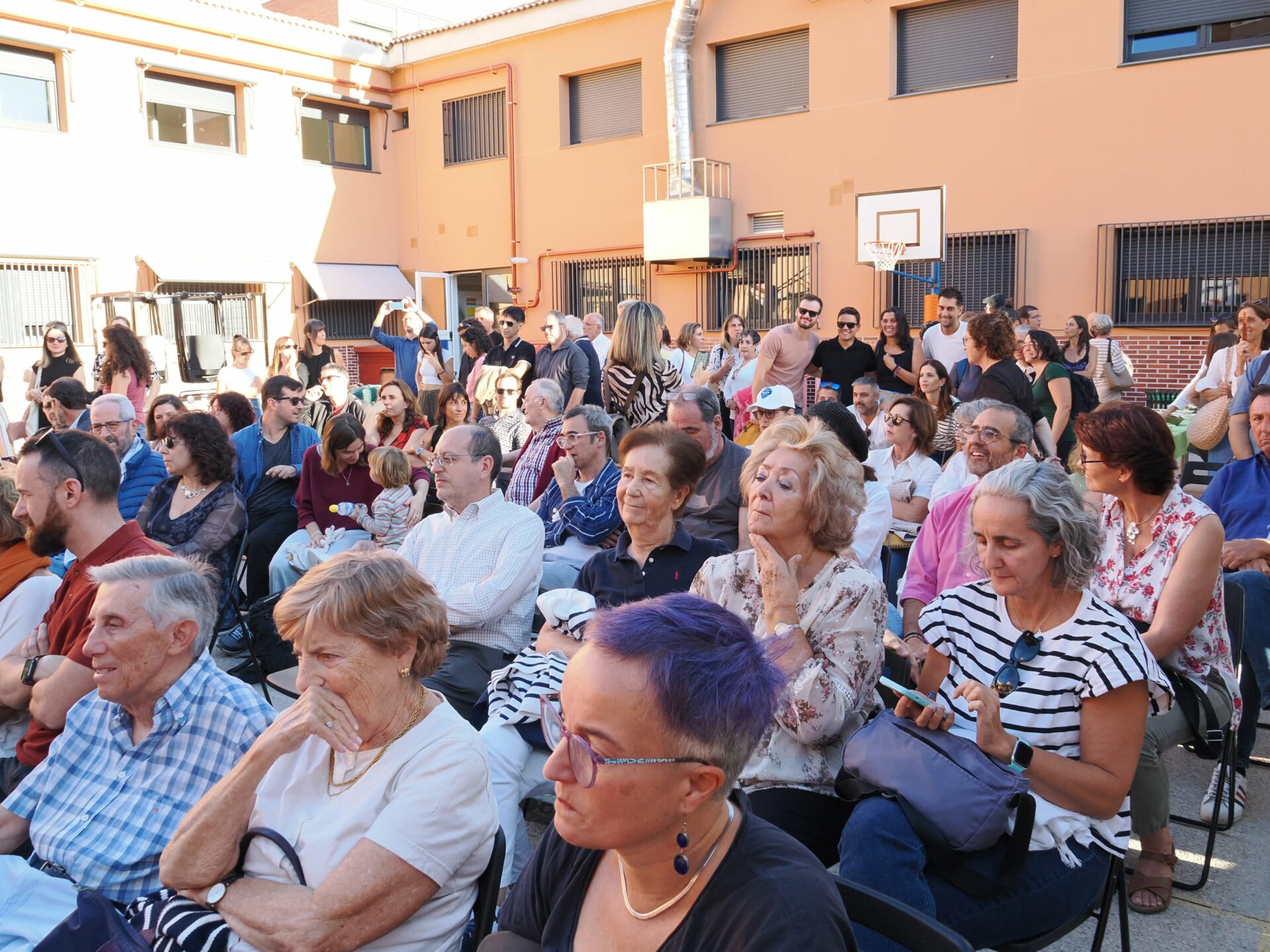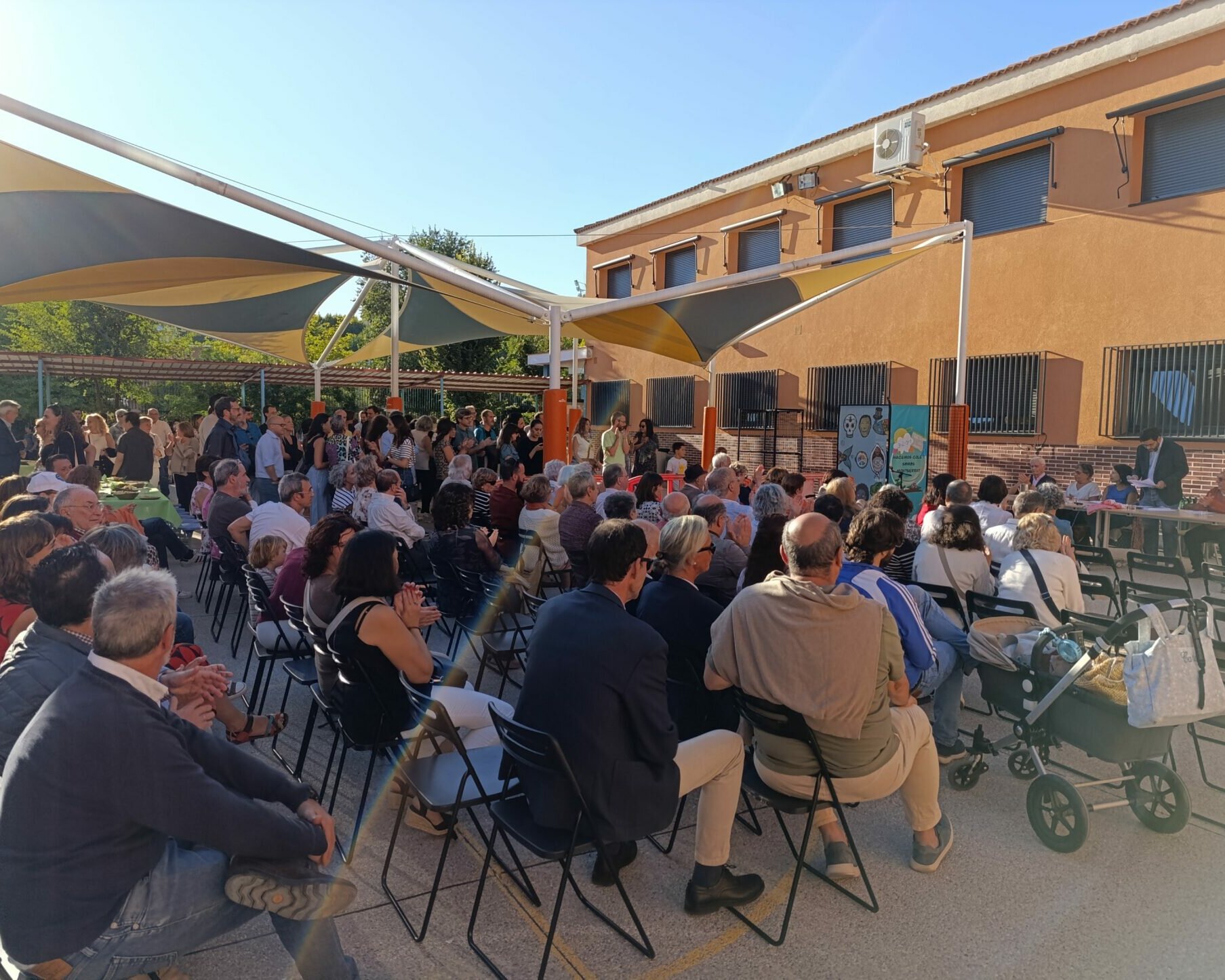 Centenares de personas se congregaron en el “Patio de la Constitución” para escuchar los testimonios de Lidia Olivera, Miguel Ángel Ortega, Juan Piqueras, Pura Silgo y Alejandro Merino, quienes desde la mesa iniciaron el acto y un turno de palabra para explicar sus vivencias desde tres lugares muy distintos: el personal de administración y servicios, las aulas y la dirección del centro en distintos momentos de la historia del Montserrat. Se mezclaron recuerdos del pasado con vivencias actuales en las que hubo tiempo para la nostalgia (incluida alguna lágrima), y también para las risas. Después continuaron desde el micrófono abierto: Arantxa Basabe y Pablo Olivera.