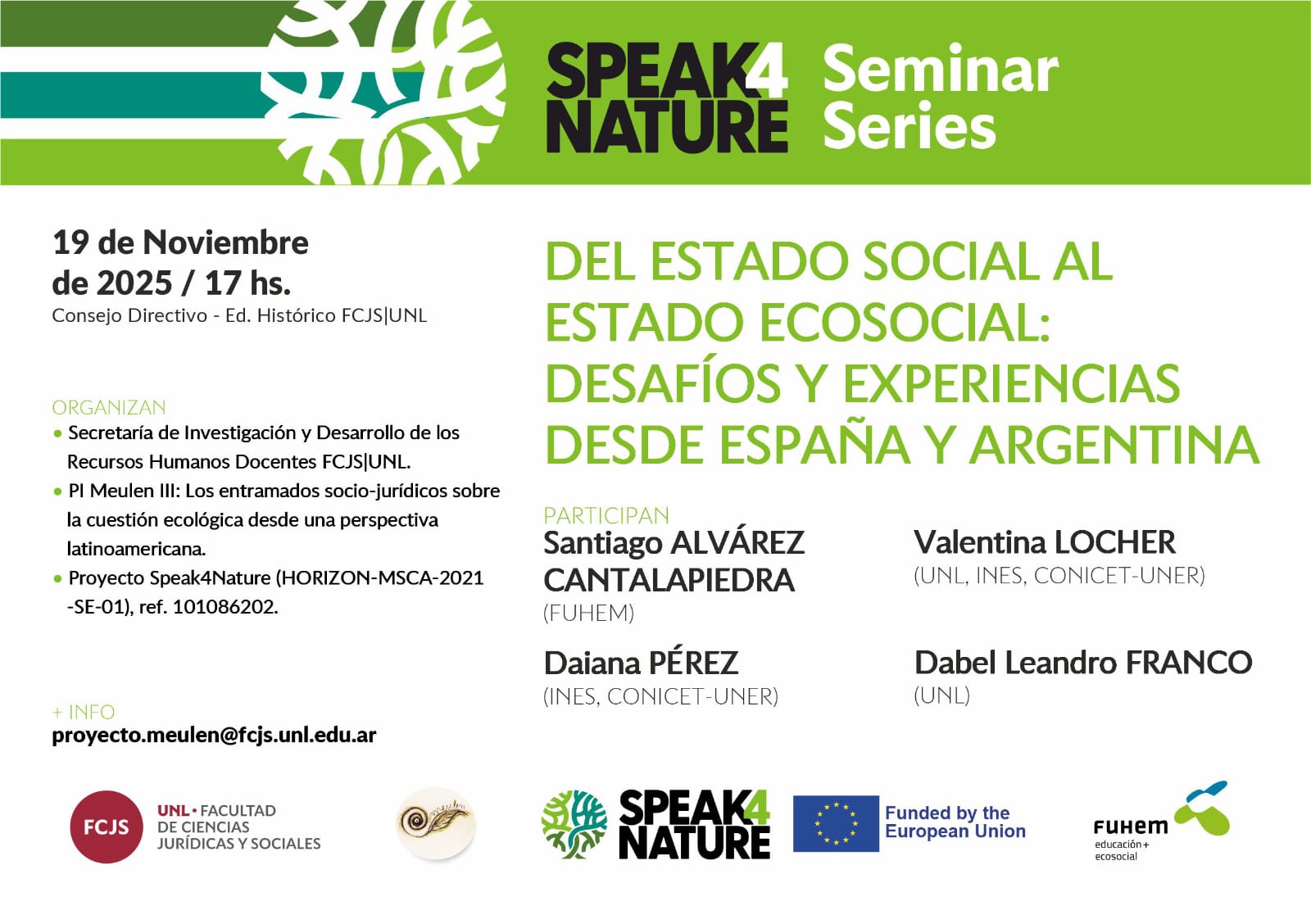 Bajo el título: Del Estado social al Estado ecosocial: desafío y experiencias desde España y Argentina, el seminario tendrá lugar el día19 de noviembre de 2025, en el Consejo Directivo del Edificio Histórico FCJS/UNL, Santa Fe, Argentina, a las 17 hora local.