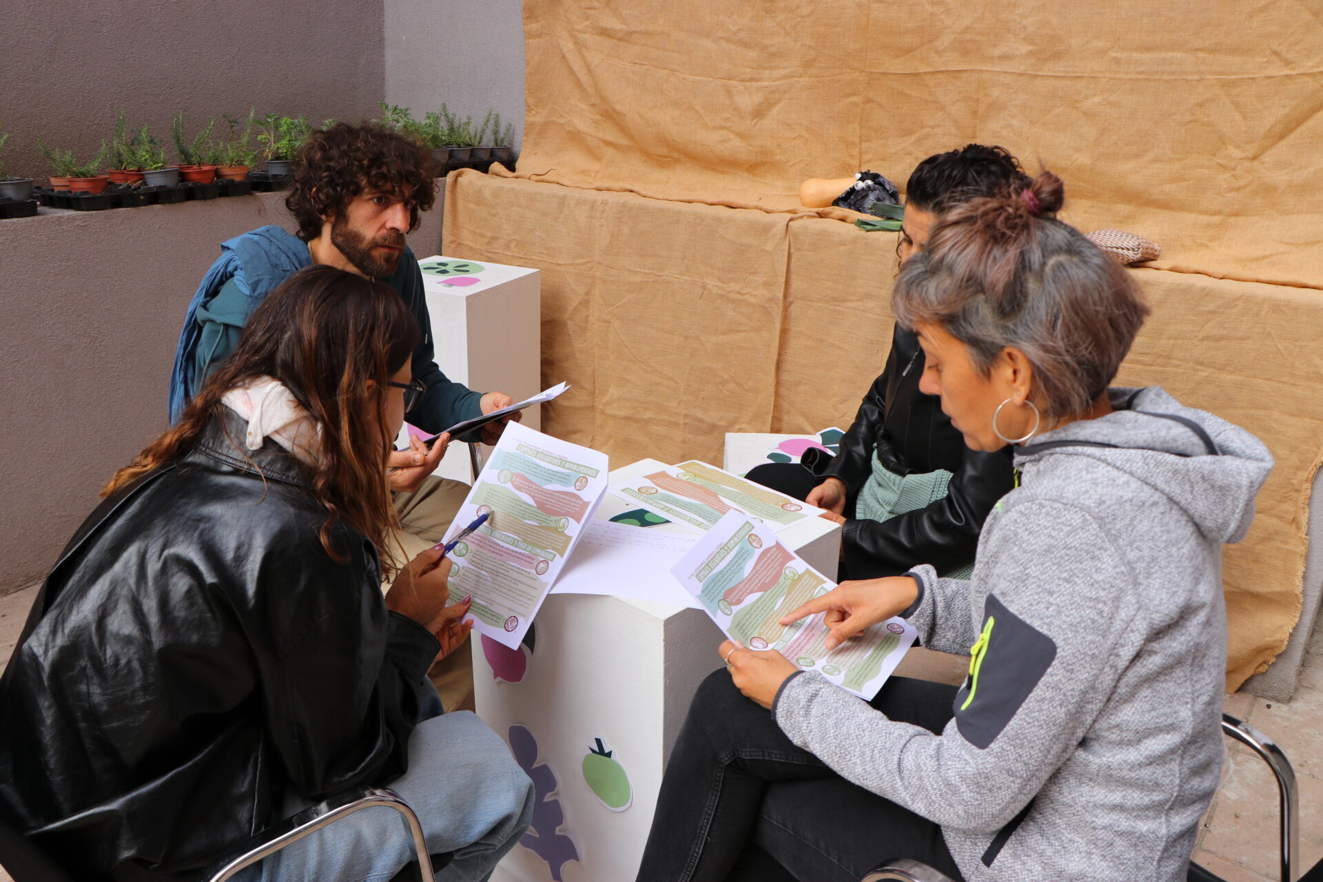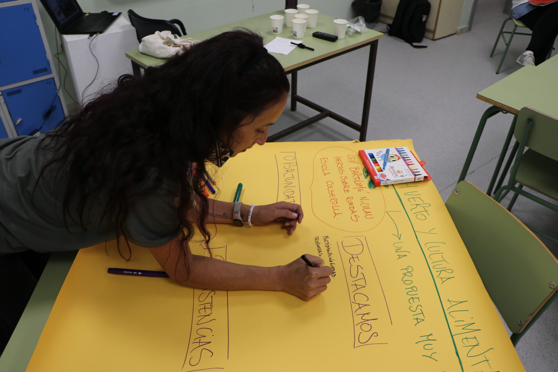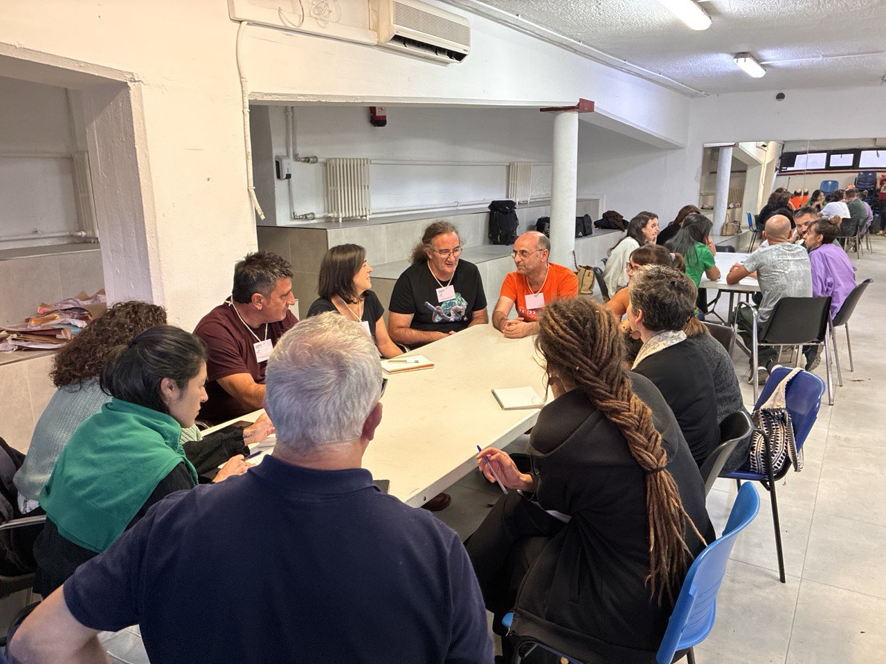 El encuentro combinó actividades de intercambio, debate y trabajo práctico en mesas temáticas. Tras una dinámica de contextualización con Germán Llerena (Xarxa Consum Solidari) sobre lo que entendemos como agroecología escolar, se abrieron cuatro mesas de intercambio y debate en torno a cuatro ejes temáticos: