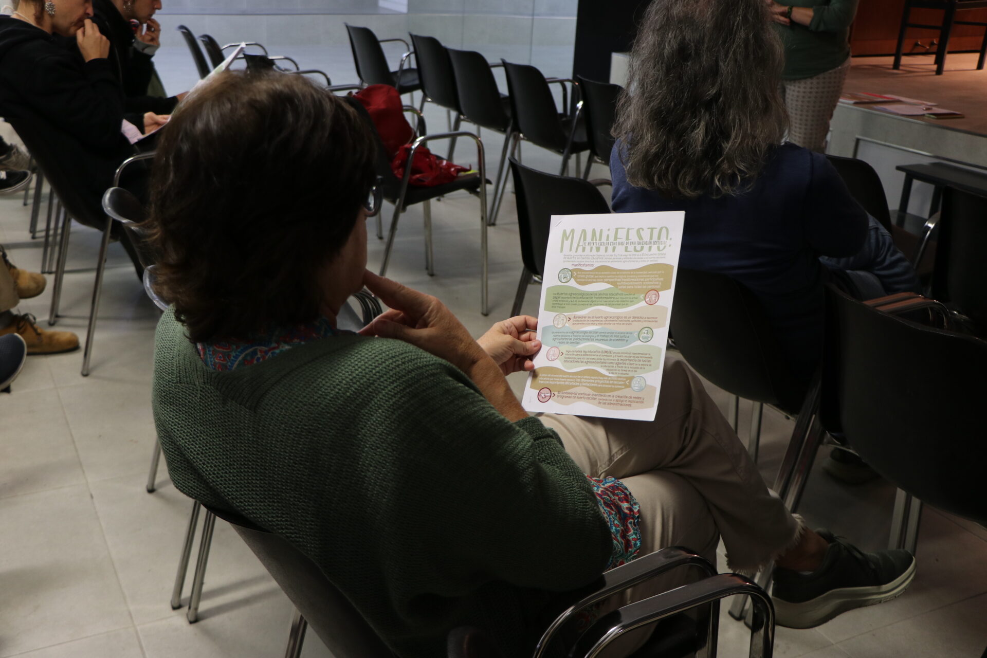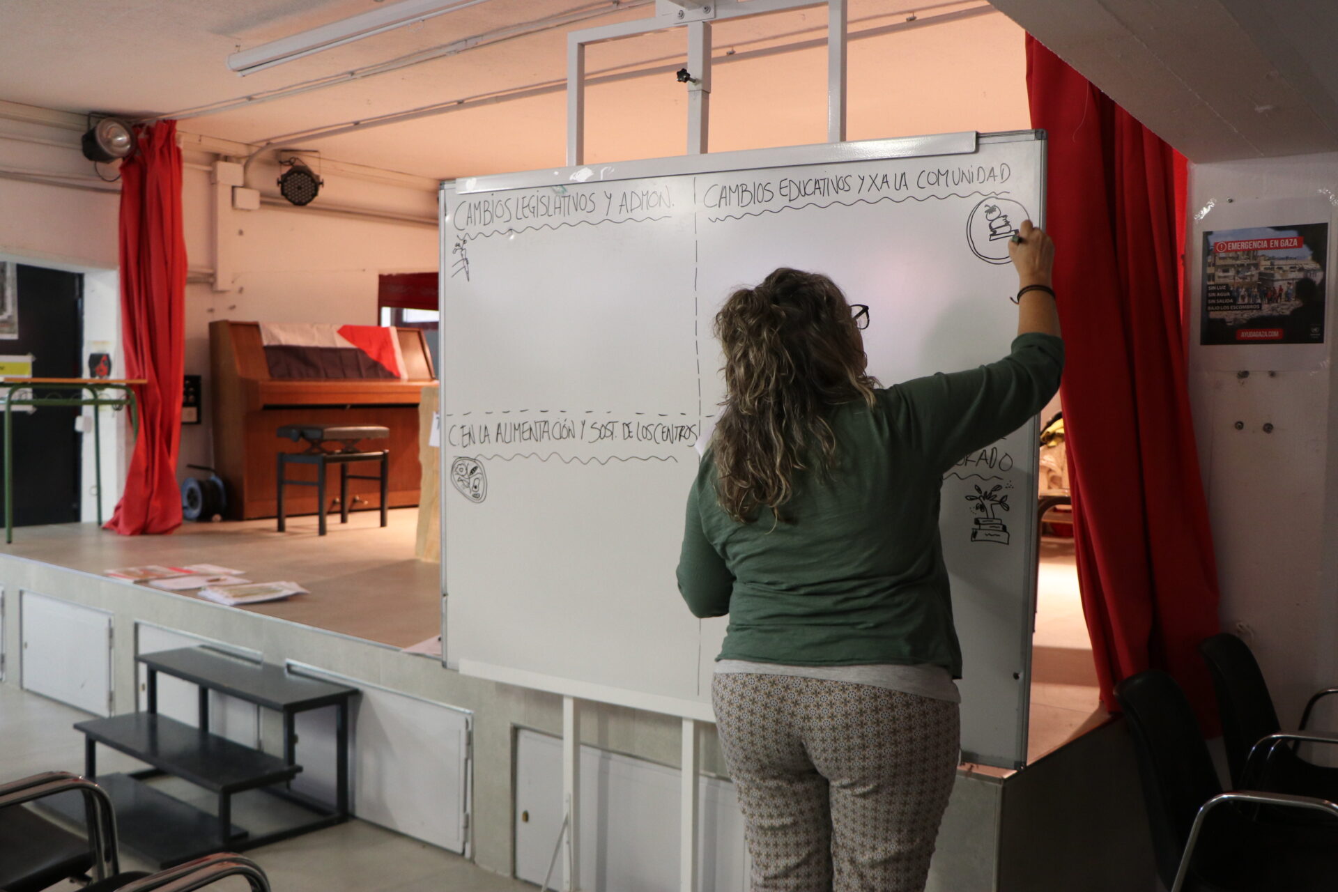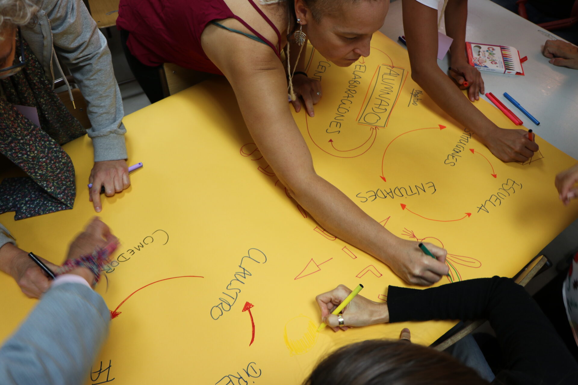 El encuentro combinó actividades de intercambio, debate y trabajo práctico en mesas temáticas. Tras una dinámica de contextualización con Germán Llerena (Xarxa Consum Solidari) sobre lo que entendemos como agroecología escolar, se abrieron cuatro mesas de intercambio y debate en torno a cuatro ejes temáticos:
