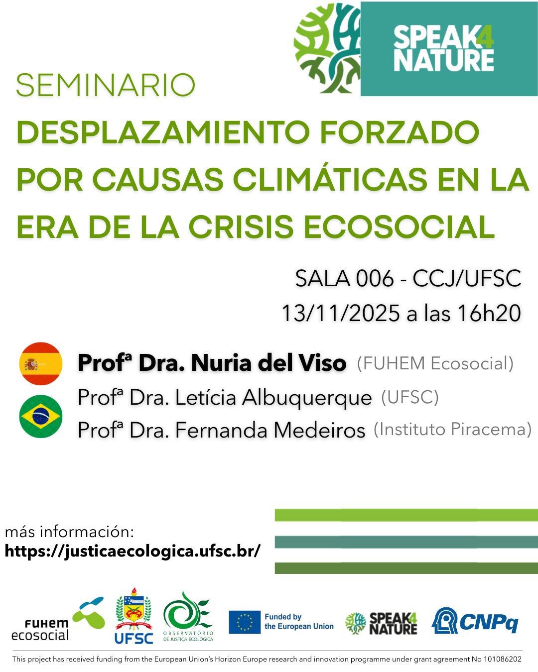En esta sesión del ciclo de Seminar Series del Proyecto Speak4Nature, se abordó el tema del Desplazamiento forzado por causas climática en la era de la crisis ecosocial, con una presentación de Nuria del Viso en la que caracterizó este fenómeno, ofreció su cuantificación con los datos disponibles y se expuso la situación de desprotección de estas personas en desplazamiento forzoso en un marco de fronteras cerradas.