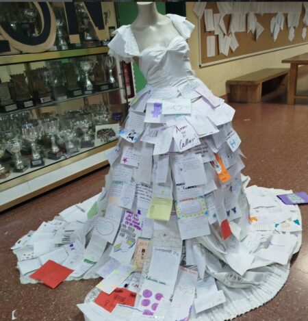 En Lourdes, se realizó una instalación artística titulada “Palabras que visten respeto”: un vestido creado con los relatos, escritos por el alumnado, mostraba el rechazo a la violencia machista y servía para reflexionar sobre los modelos relacionales. Las diversas páginas se convirtieron en grandes historias que cuidan, respetan y visten a la mujer.