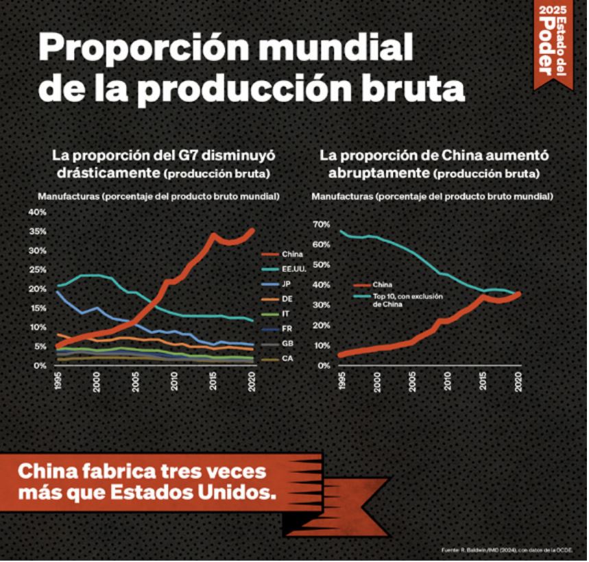 A su vez, la otra cara de la desindustrialización estadounidense fue la superindustrialización de China, que ha sido el país que ha pasado más rápidamente de ser un actor totalmente externo a convertirse en una pieza central del sistema capitalista mundial. Esto ocurrió en un periodo de alrededor de 30 años e implicó una rápida industrialización y adquisición tecnológica, como resultado de las cuales la base científica y tecnológica del país es en gran medida autosuficiente.