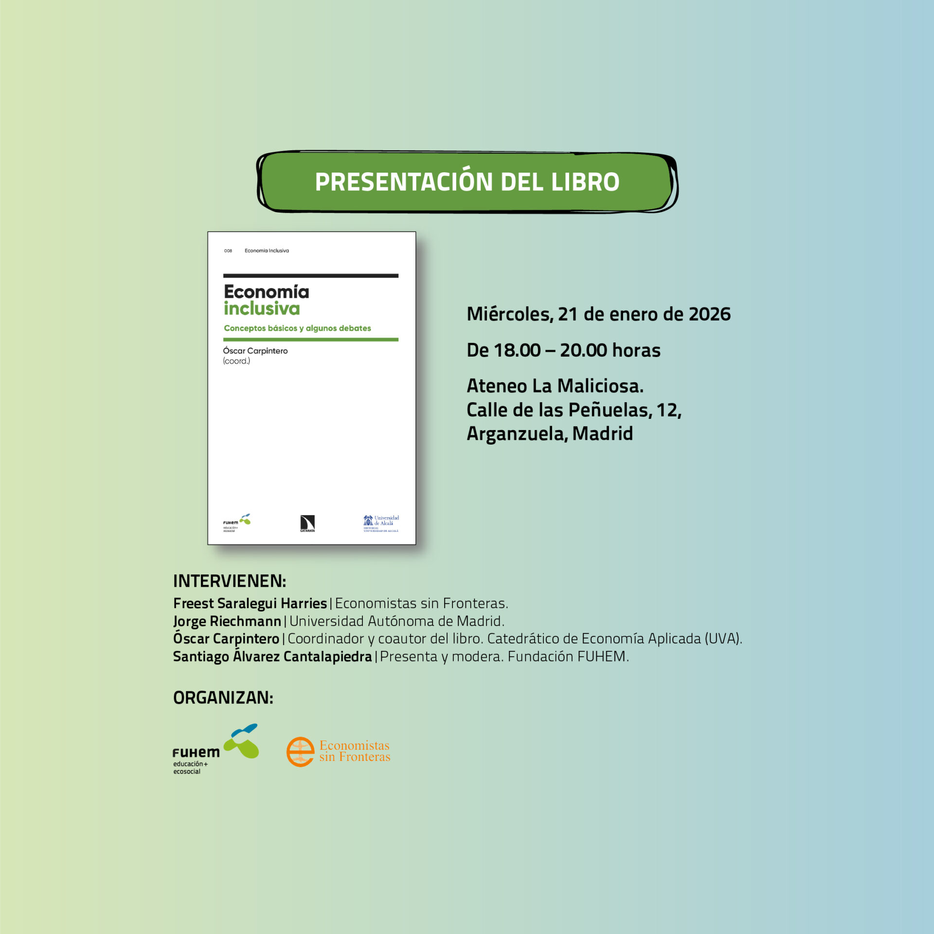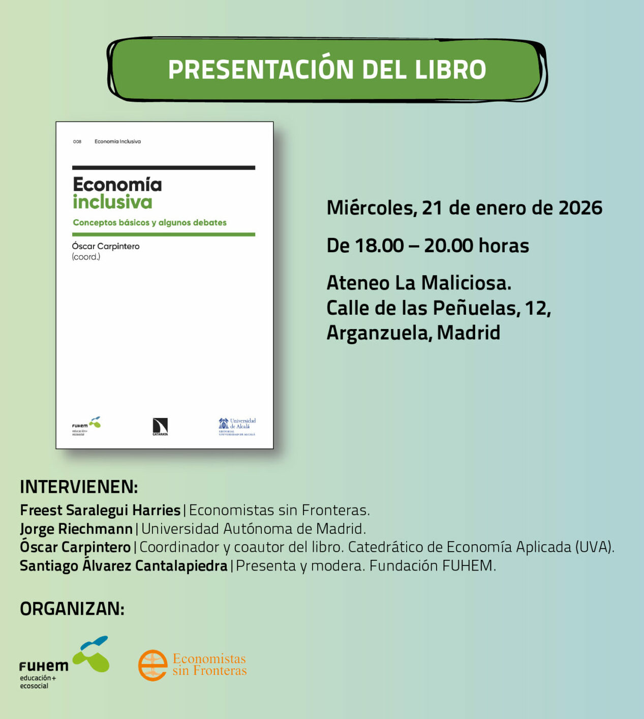 FUHEM Ecosocial presenta el libro Economía Inclusiva: conceptos básicos y algunos debates, coordinado por Óscar Carpintero, catedrático de Economía Aplicada en la Universidad de Valladolid, y que constituye la entrega número 8 de la Colección Economía Inclusiva, coeditada por FUHEM, La Catarata y Universidad de Alcalá de Henares.