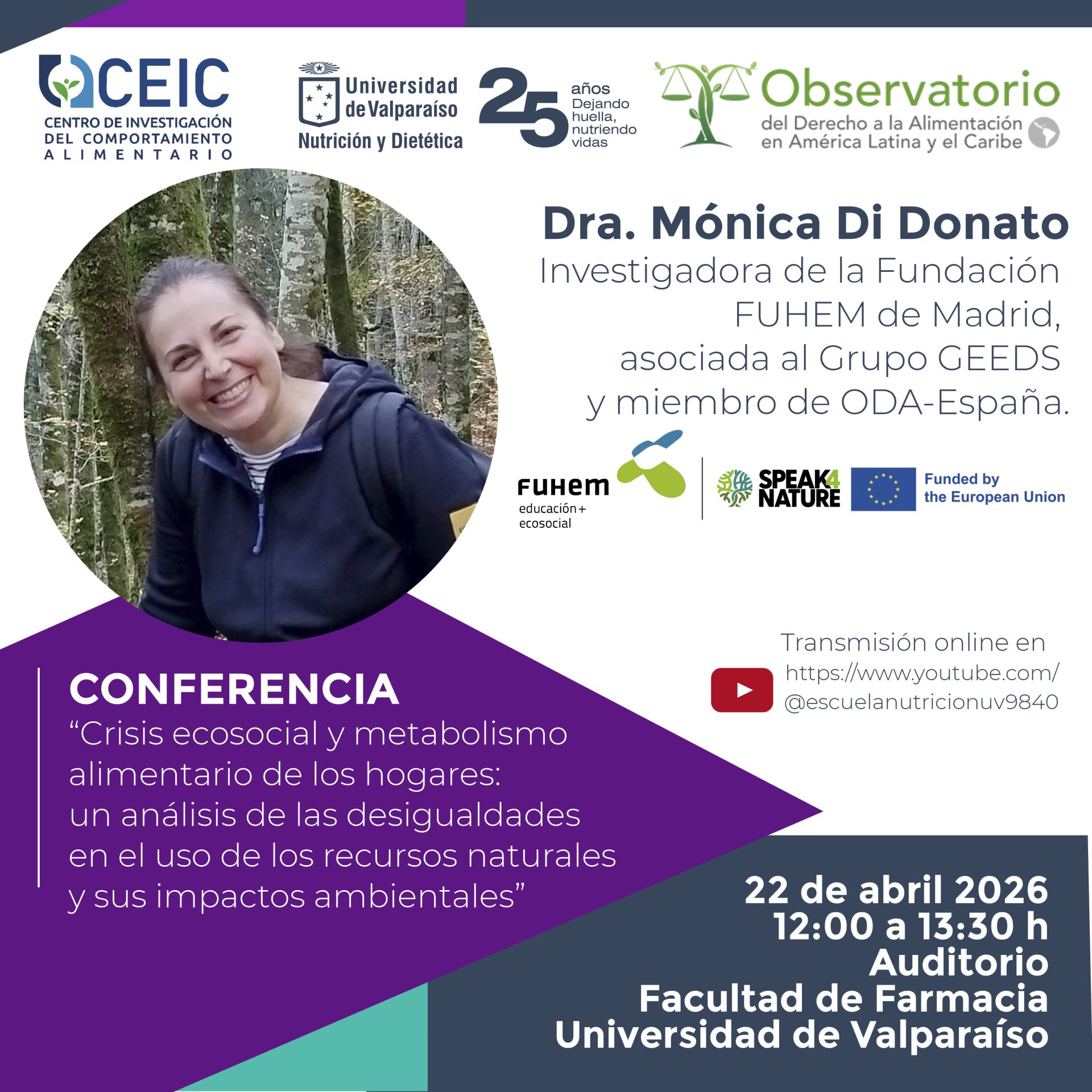 En el marco del proyecto de Speak4 Nature y ODA-Chile, Monica Di Donato, del equipo de FUHEM Ecosocial, imparte la Conferencia: Crisis ecosocial y metabolismo alimentario de los hogares: un análisis de las desigualdades en el uso de los recursos naturales y sus impactos ambientales.
