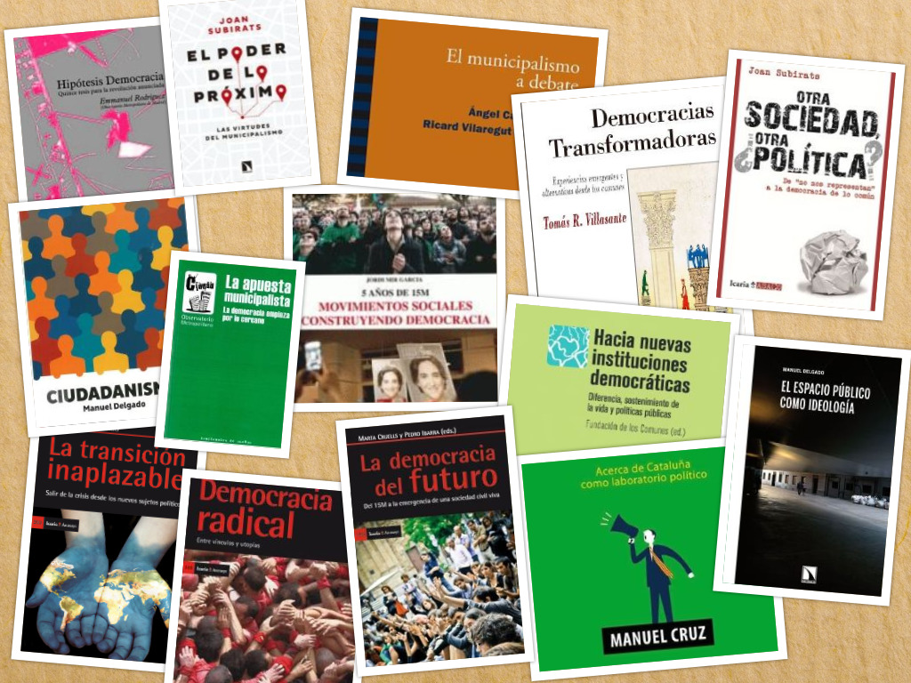 Recopilación bibliográfica sobre cómo los movimientos sociales han sido el germen para la creación de nuevos territorios en democracia, sobre una democracia que empieza desde lo cercano, desde el poder de lo próximo. Libros que abordan las virtudes y los problemas e inconvenientes a los que se enfrentan los nuevos municipalismos. Destacamos textos de Ángel Calle, Marta Cruells, Pedro Inbarra, Manuel Cruz, Manuel Delgado, Fundación de los Comunes, Jordi Mir, Observatorio Metropolitano, Emmanuel Rodríguez, Joan Subirats y Tomás R. Villasantte.